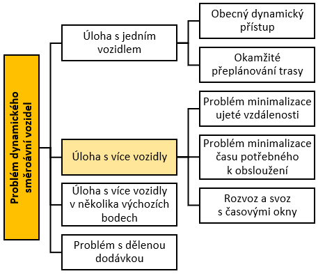 Úloha s více vozidly je logickým rozšířením dynamické úlohy, které nabízí navýšení omezené kapacity jednoho vozidla o kapacitu vozidla dalšího. Dochází k minimalizaci času čekání zákazníka na obsloužení pouze jedním vozidlem. Předpokladem je neomezený počet vozidel ve výchozím místě a primárním cílem se stává přijmout co největší počet požadavků. Této problematice se věnuje řada prací (Bertsimas & van Ryzin, 1991; 1993; Gendreau a kol., 1999; Attanasio a kol., 2004; Haghani & Jung, 2005; Potvin & Benyahia, 2006).