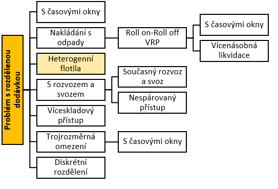 Využití heterogenní flotily vozidel (Gasque & Munari, 2022; Rajaei a kol., 2022) je zajímavou variantou SDVRP. Klade si za cíl určit trasy pro heterogenní vozidla s různou nosností a zároveň snížit náklady na systém tím, že umožní vyzvednutí a rozdělení dodávky u zákazníka (Mahjoob a kol., 2021).